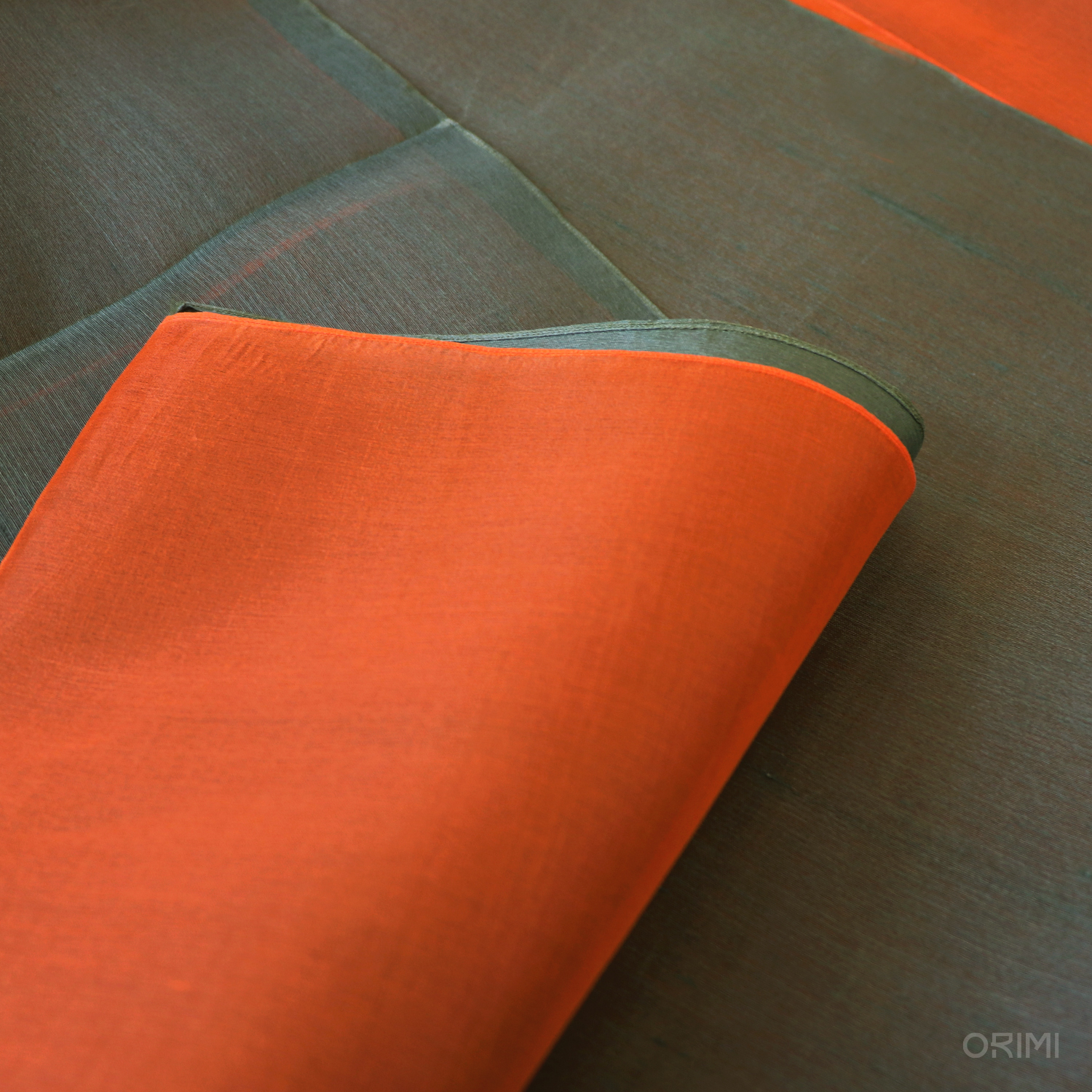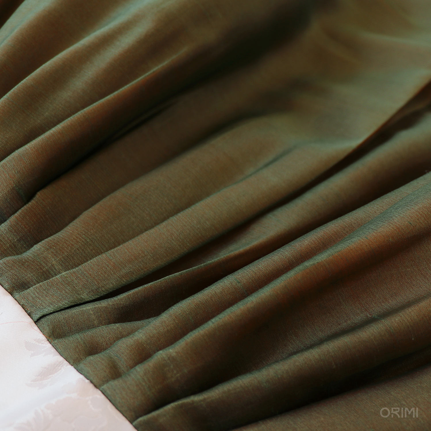 거친 가로결을 그리며 짜여진 풀색 치마의 안쪽엔 선명한 주홍빛 안감이 자리잡고 있습니다. 이 붉은빛 덕분에 겉에서 보이는 치마의 색상이 상당히 오묘해지면서 신비로운 느낌을 자아냅니다.