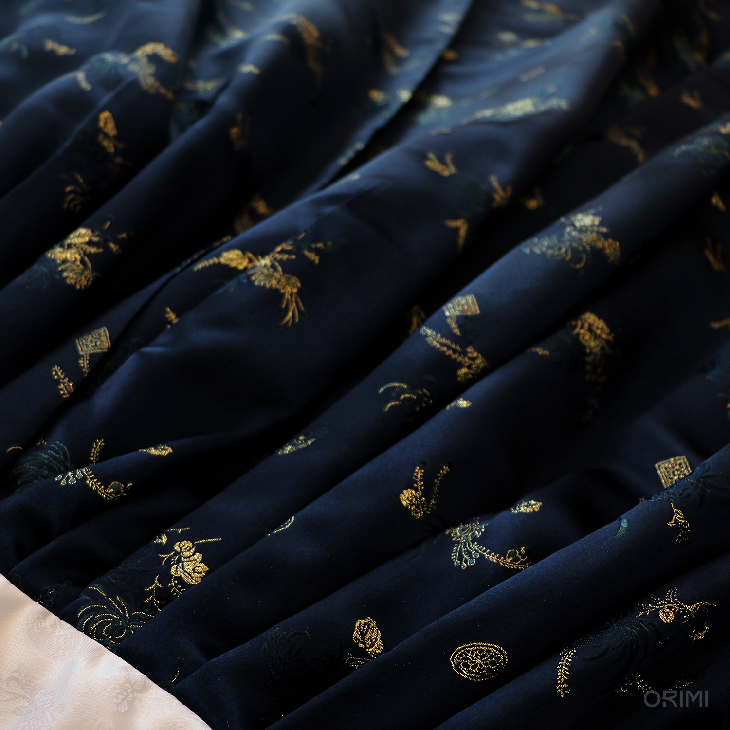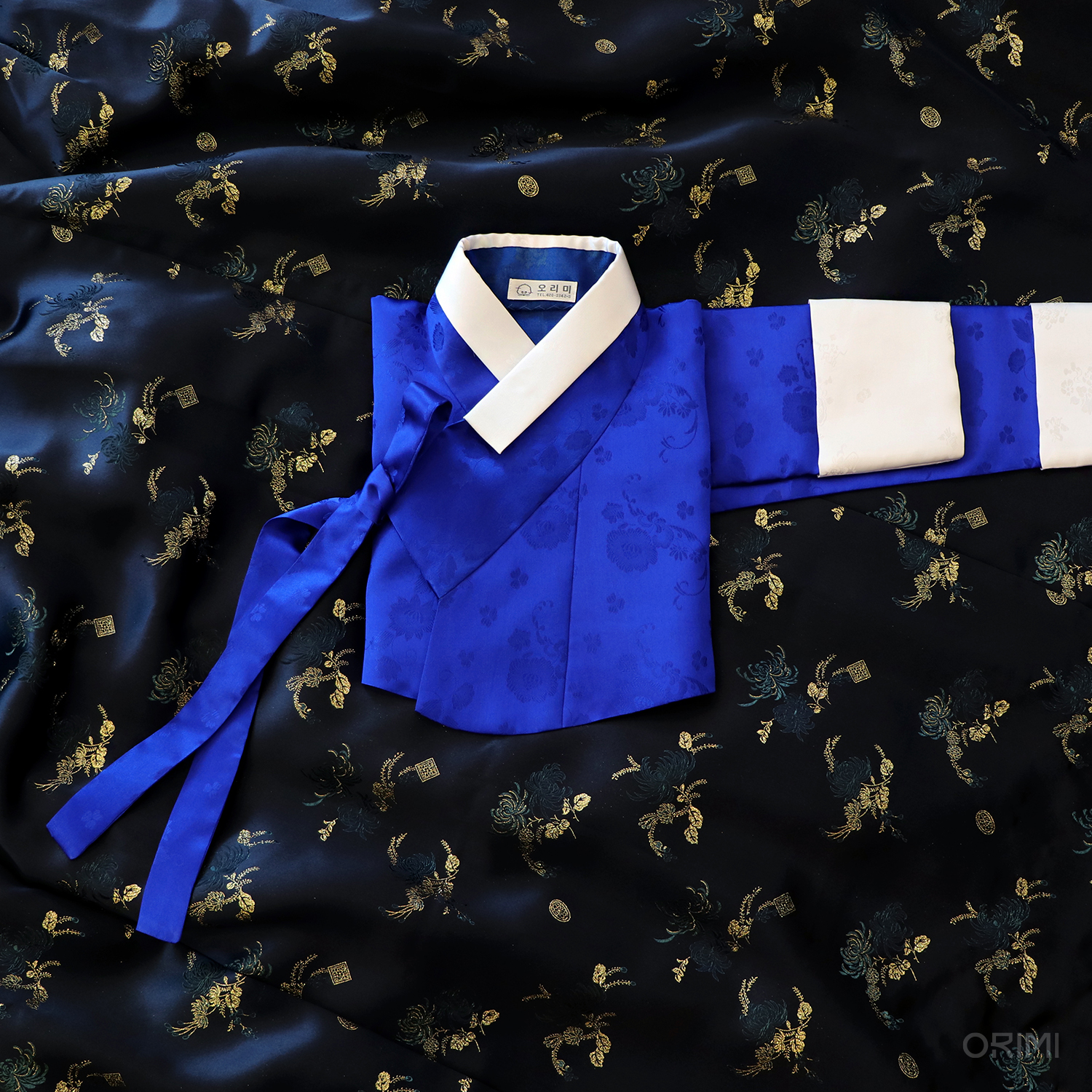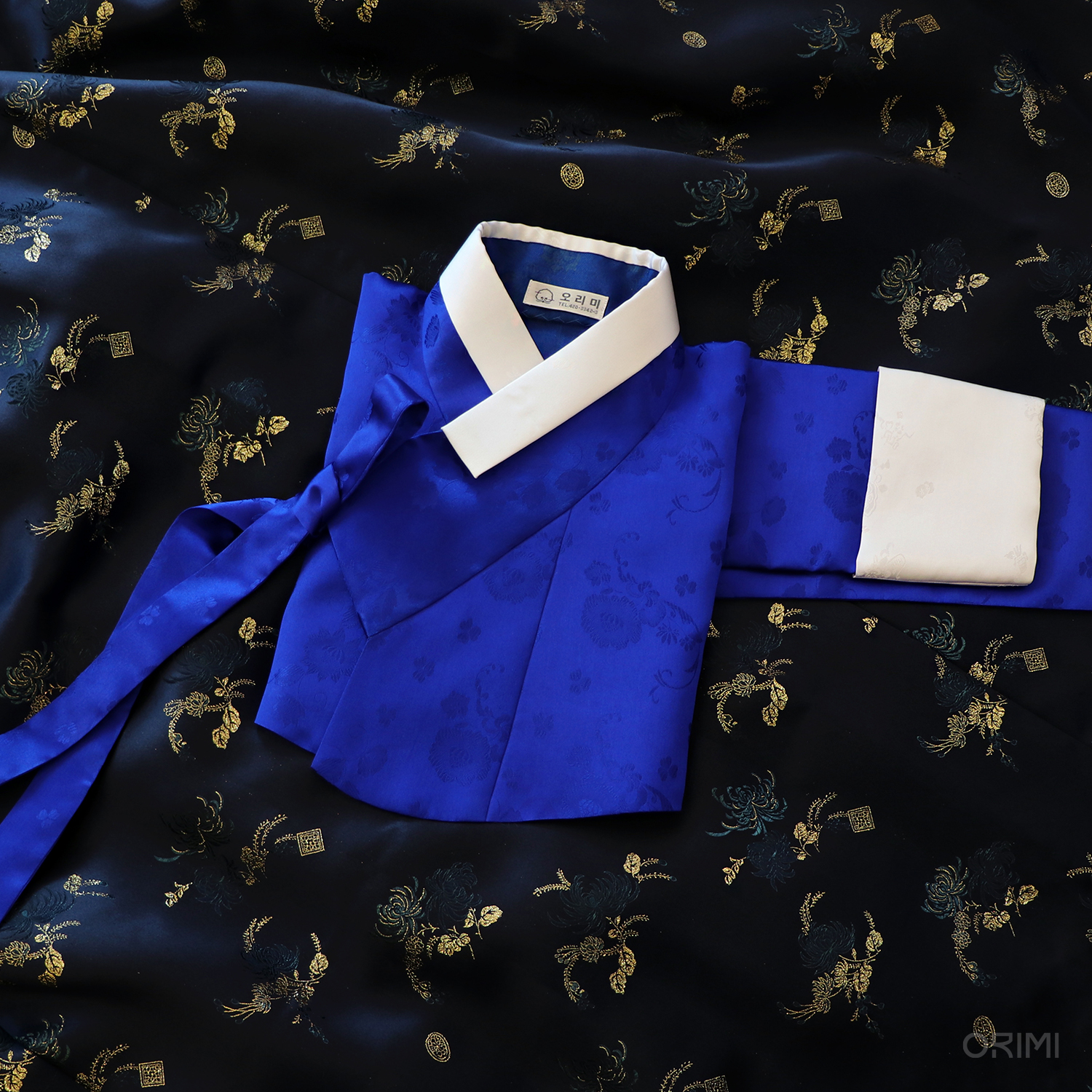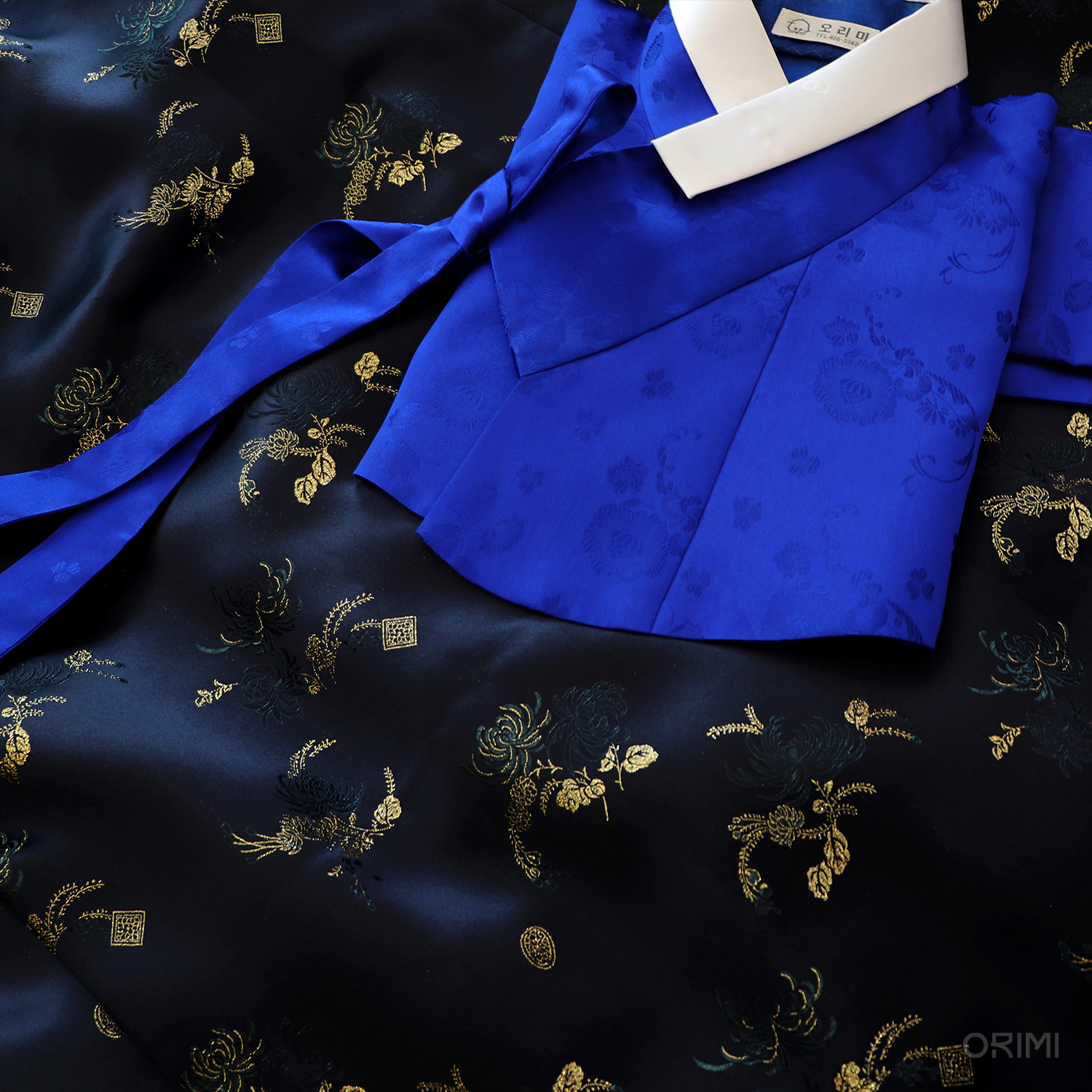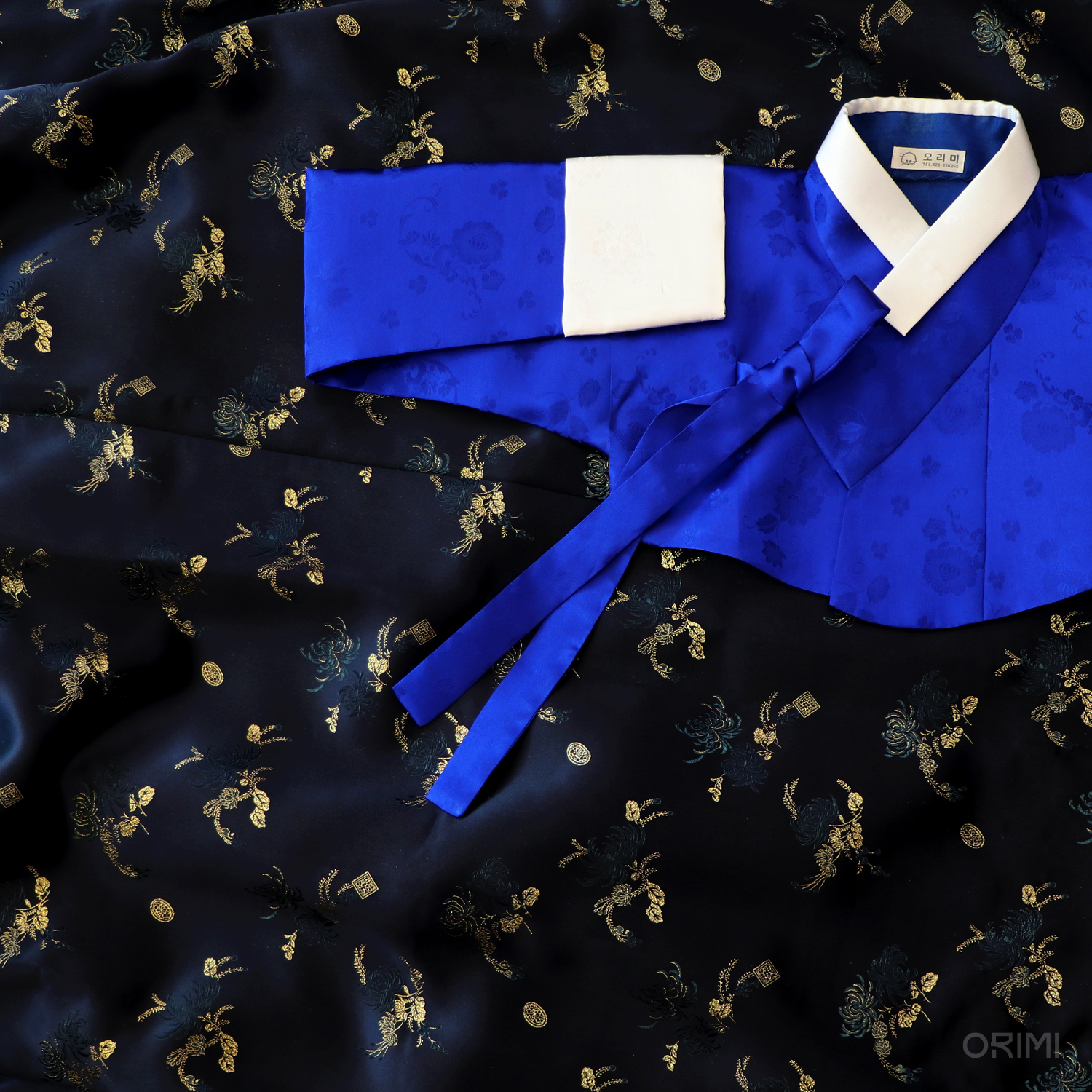 금사로 짜여진 화려한 국화 문양이 시선을 먼저 사로잡지만, 검정색에 가까운 진한 남색 바탕 덕분에 고급스러운 화려함을 내뿜는 듯 합니다.