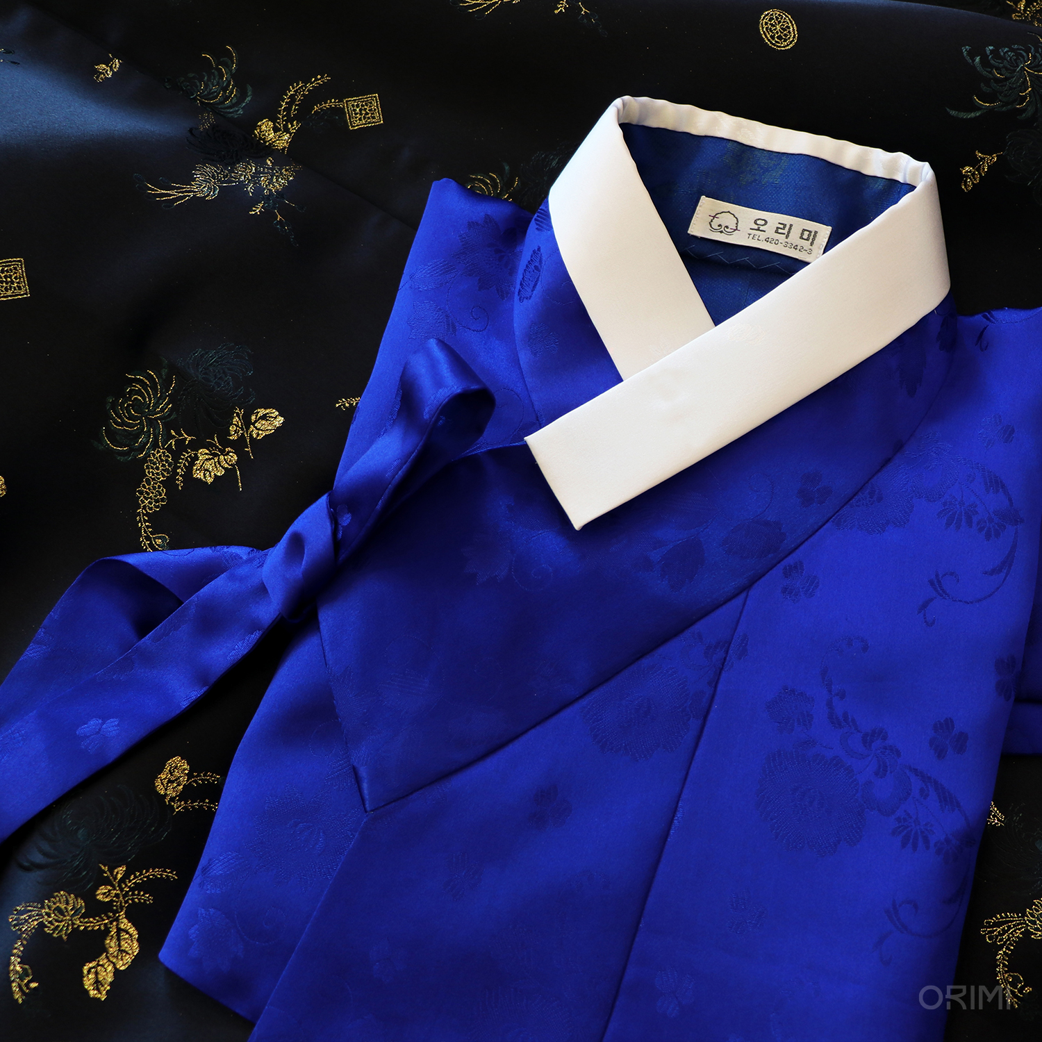 선명한 새파란 색의 저고리에 진한 남색의 양단 치마를 함께했습니다.