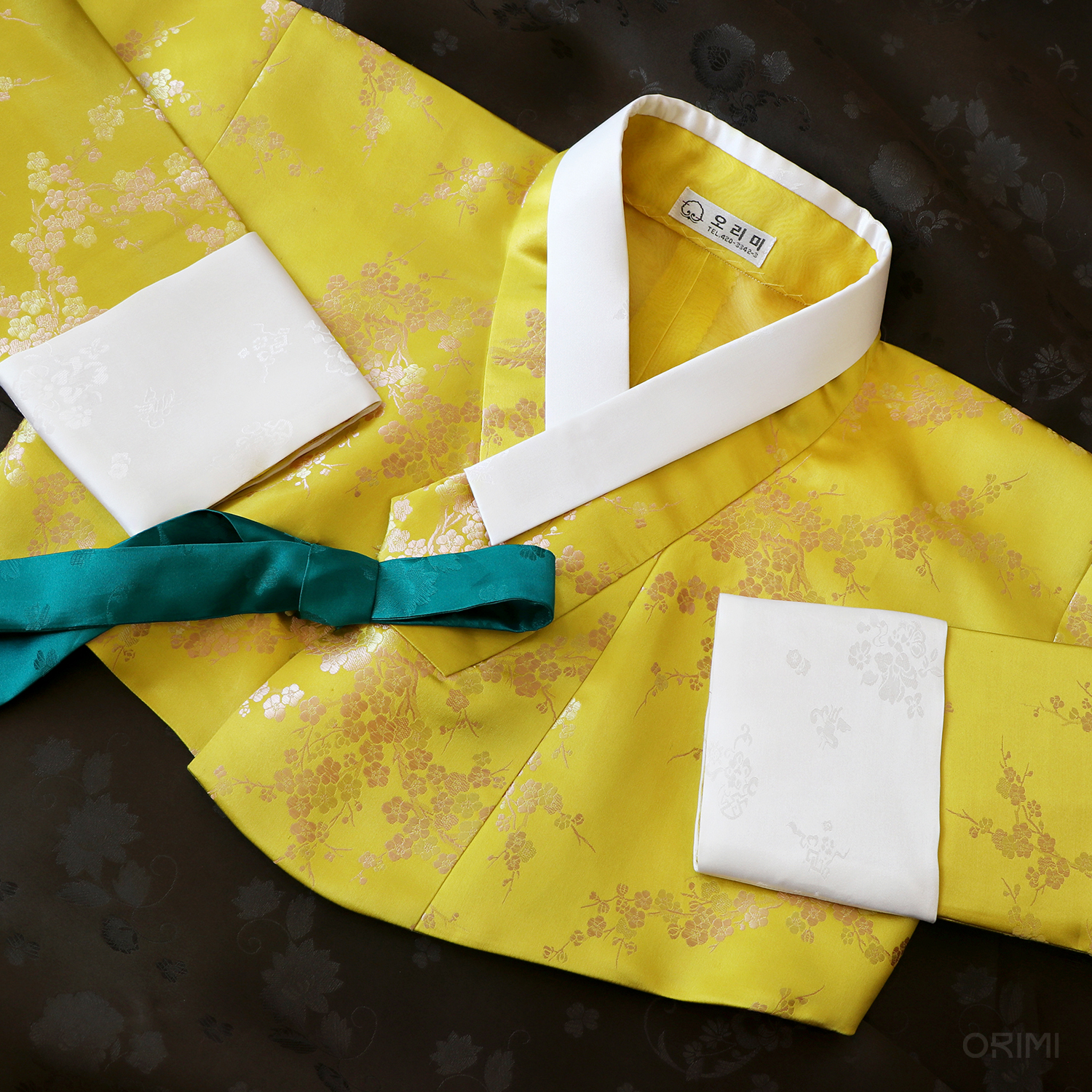 매화꽃에 핀 금빛 광택이 아름다운 노란색 저고리에는 청록색 고름을 달았습니다. 짙은 고동색 치마 위에서 더욱 빛나는 저고리에요.
