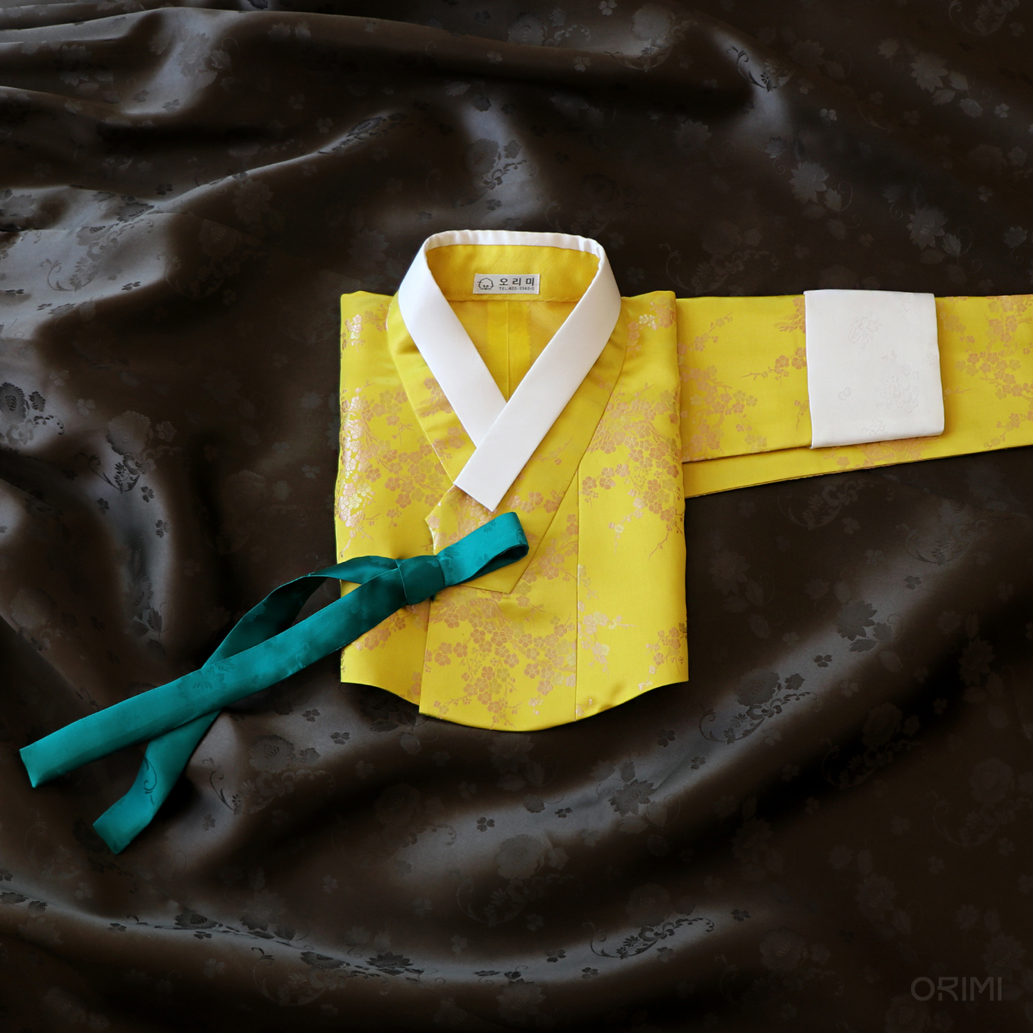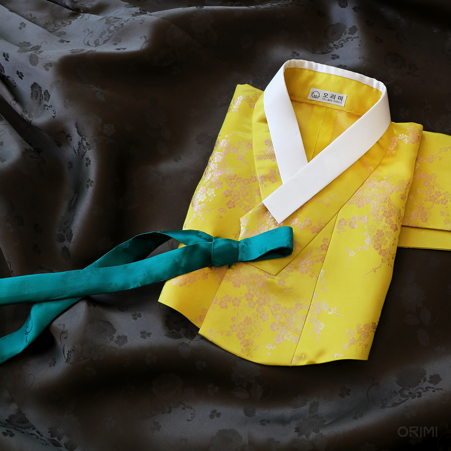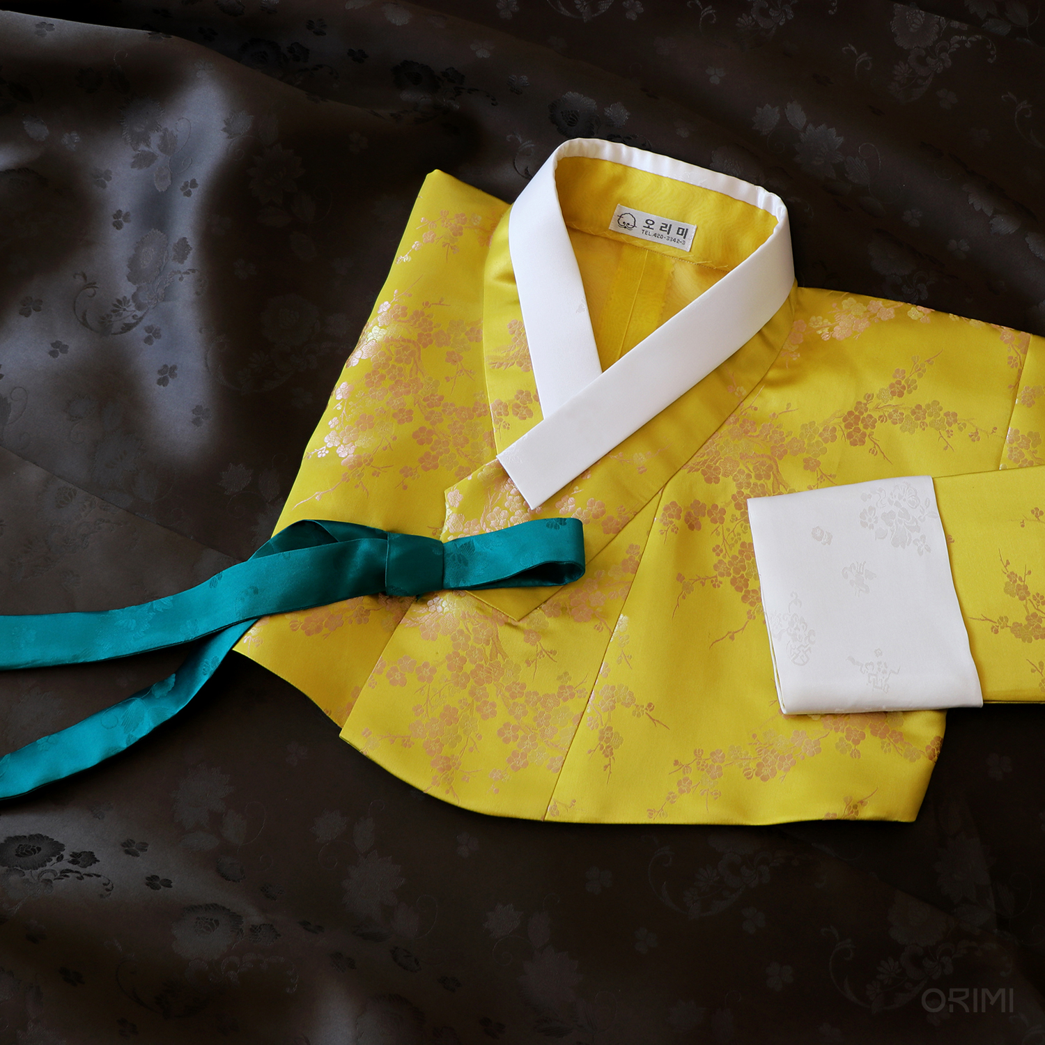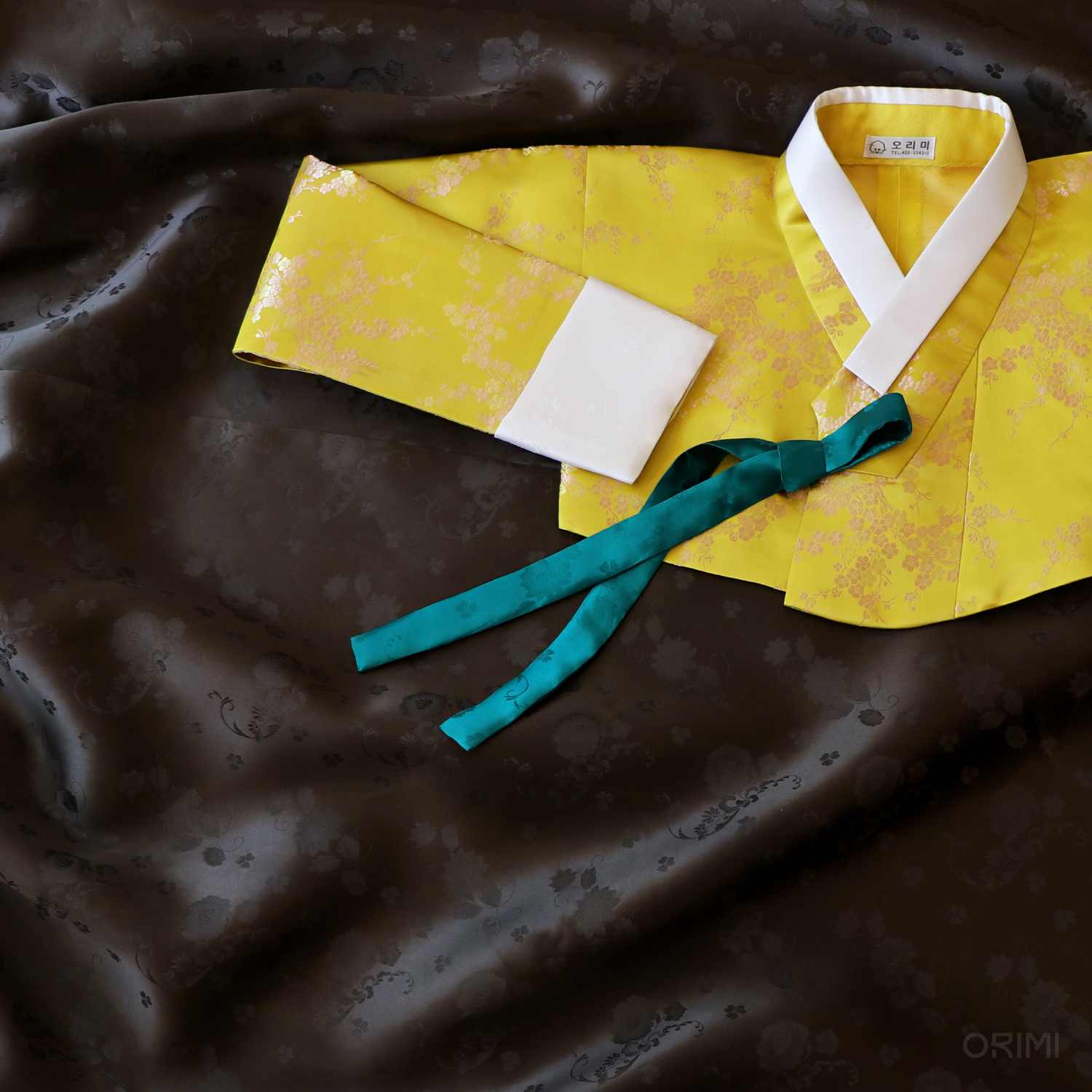 매화꽃에 핀 금빛 광택이 아름다운 노란색 저고리에는 청록색 고름을 달았습니다. 짙은 고동색 치마 위에서 더욱 빛나는 저고리에요.