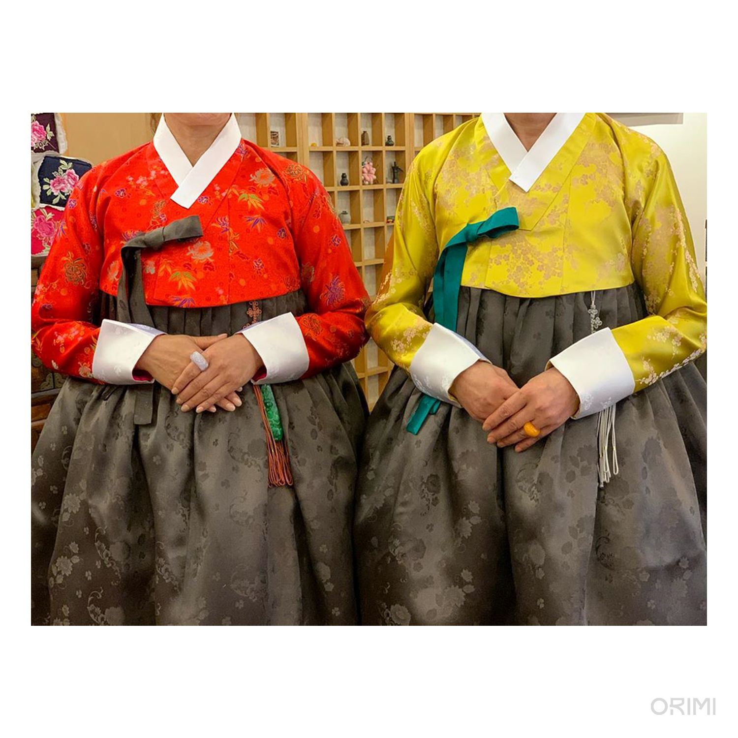 같은 색상의 치마에 빨간 양단 저고리를 맞추신 친정 어머님과, 노란 저고리의 시어머님 두 분께서 나란히 함께 서 보았습니다. 두 분의 취향과 체형에 알맞는 핏으로 각각 제작하였고, 완성된 옷들이 모두 아름답게 잘 어울리셔서 흐뭇했던 날의 기록입니다.