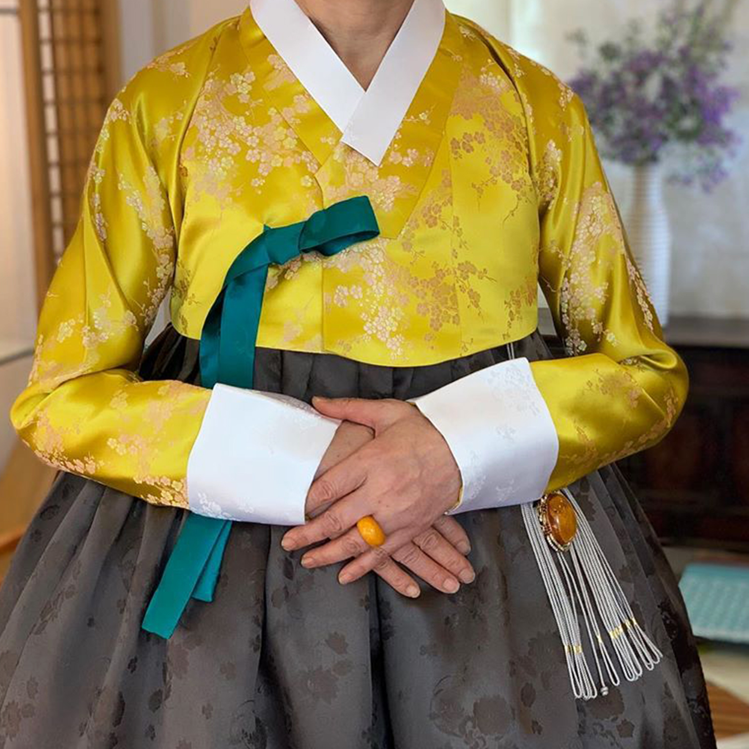 매끈한 광택과 도톰한 두께를 자랑하는 노랑색 양단으로 저고리를 짓고, 새하얀 비단으로 동정과 거들지를 달아 마무리합니다. 진고동색 치마와 함께한 노랑 저고리엔 청록색 고름을 달아 더욱 멋지게 매력을 뽐내는 시어머님의 혼주한복입니다.