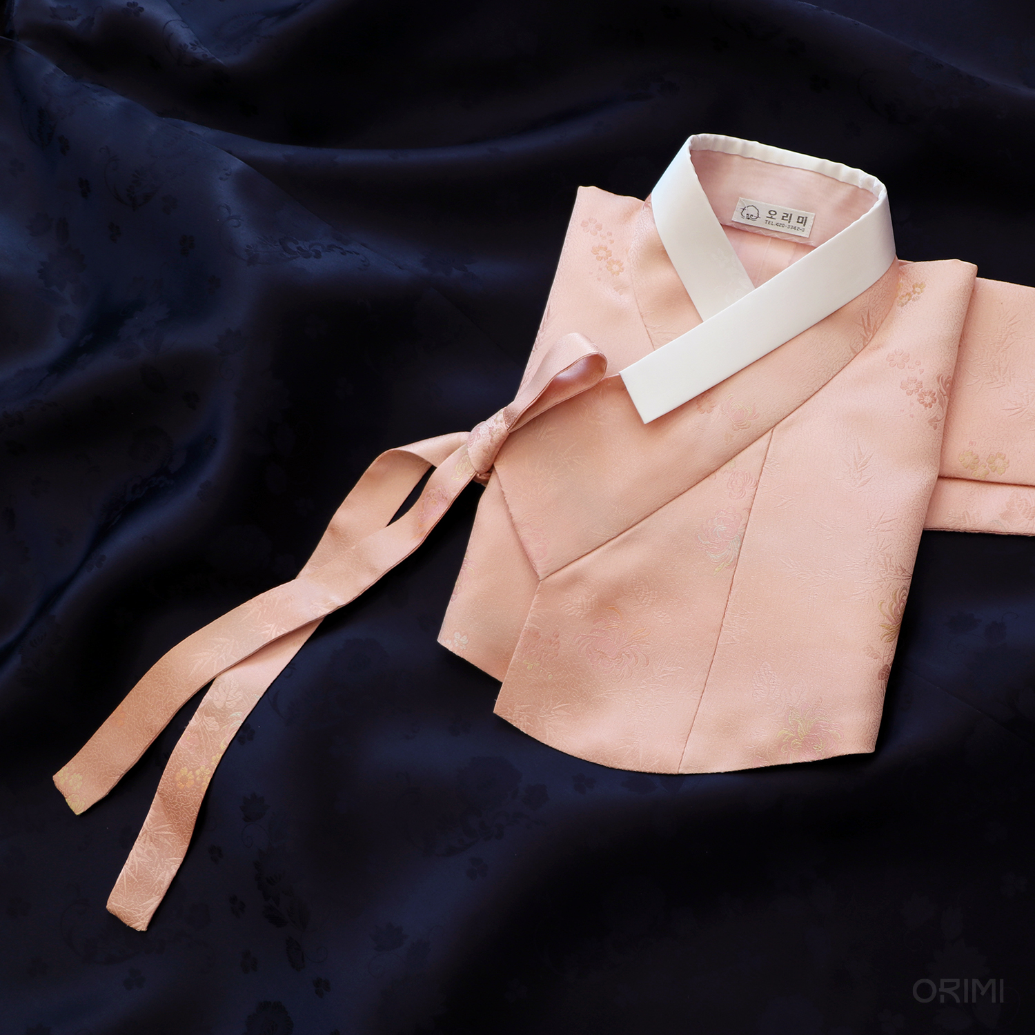 분홍색 바탕 위에 있는 듯 없는 듯 은은한 파스텔톤 색실들과 분홍색 실들로 다양한 크기의 국화들이 피어난 양단으로 지은 저고리입니다. 고름까지 같은 원단으로 통일해서 더욱 군더더기 없이 깔끔한 한복이 지어졌어요.