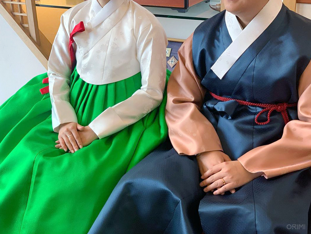 신부님의 빨간 고름처럼, 신랑님의 쾌자 위에는 차분한 붉은 색 술띠를 장식으로 둘렀어요. 신부님과 신랑님 모두 각자의 이미지에 어울리면서 장점을 더 돋보이도록 원단과 색을 구성했고, 함께 나란히 섰을 때 서로를 돋보이게 해 줄 수 있는 구성을 하려고 노력하는 것이 오리미의 스타일이랍니다.