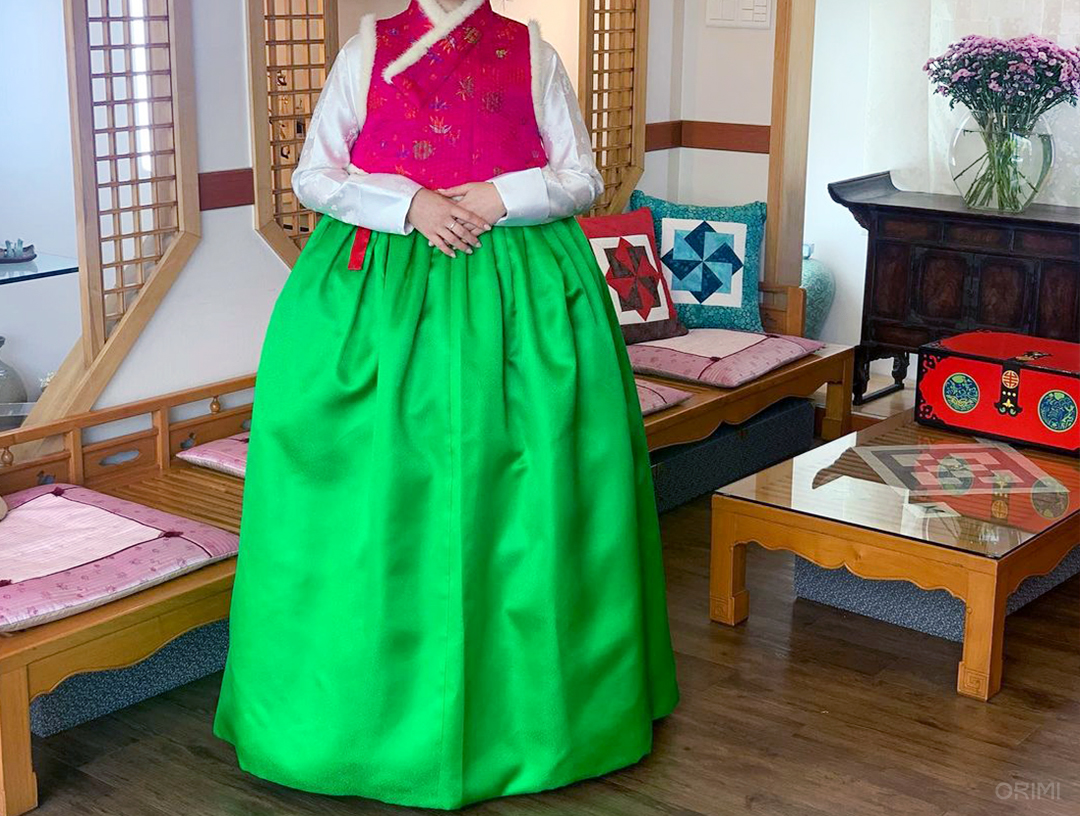 두터운 두께 때문에 안감의 색은 겉의 색감에 영향을 주지 않는 양단 치마입니다. 그래서 안감으로는 가끔 이렇게 강렬한 색을 넣어 반전의 매력을 숨겨 두기도 해요.