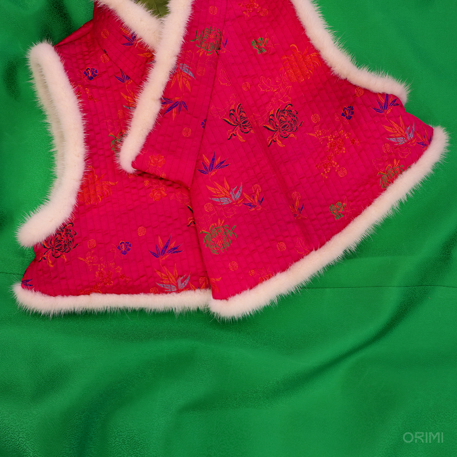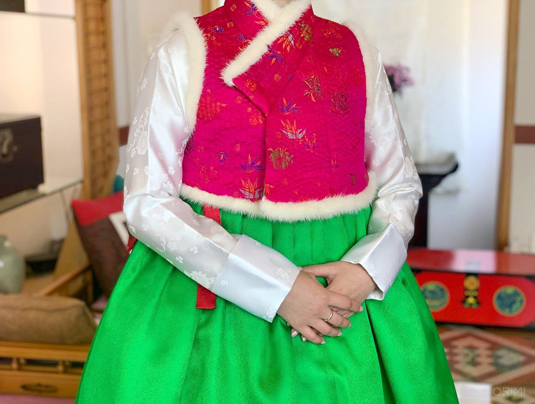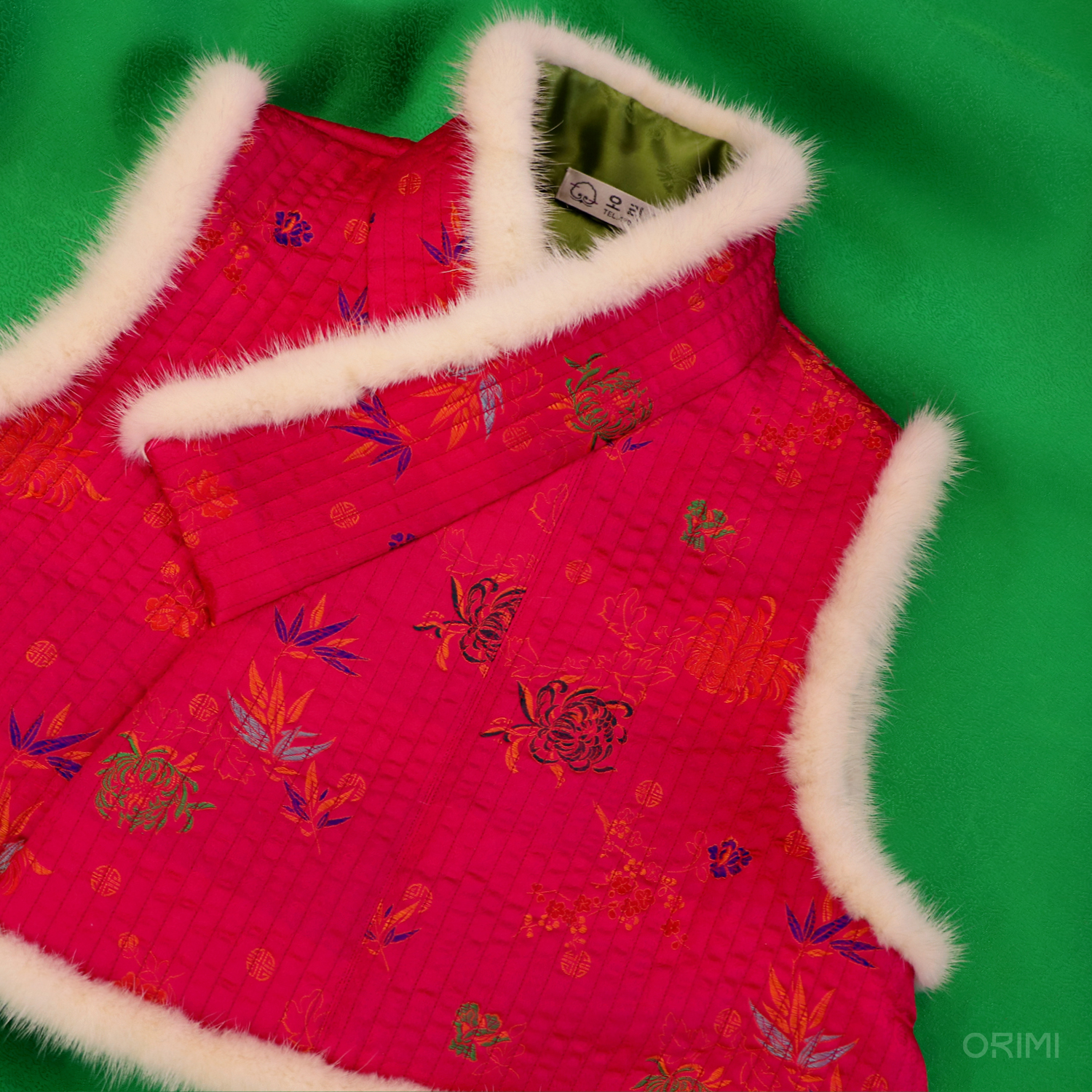 선명한 꽃분홍색 양단을 누비고, 털을 달아 마무리한 털배자는 하얀 저고리와 초록 치마 위에서 더욱 더 매력을 발할 거에요. 시어머님께서 깜짝 선물로 준비해 주신 털배자가 더해진 신부한복 한 벌입니다.