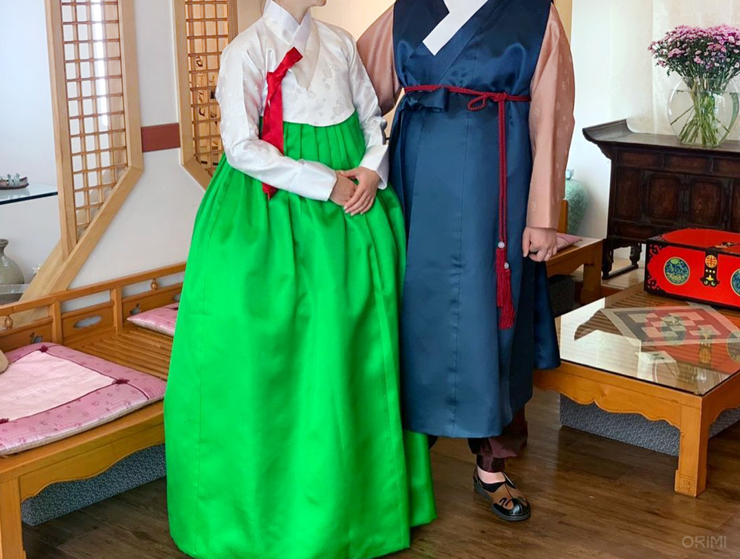 신부님의 빨간 고름처럼, 신랑님의 쾌자 위에는 차분한 붉은 색 술띠를 장식으로 둘렀어요. 신부님과 신랑님 모두 각자의 이미지에 어울리면서 장점을 더 돋보이도록 원단과 색을 구성했고, 함께 나란히 섰을 때 서로를 돋보이게 해 줄 수 있는 구성을 하려고 노력하는 것이 오리미의 스타일이랍니다.