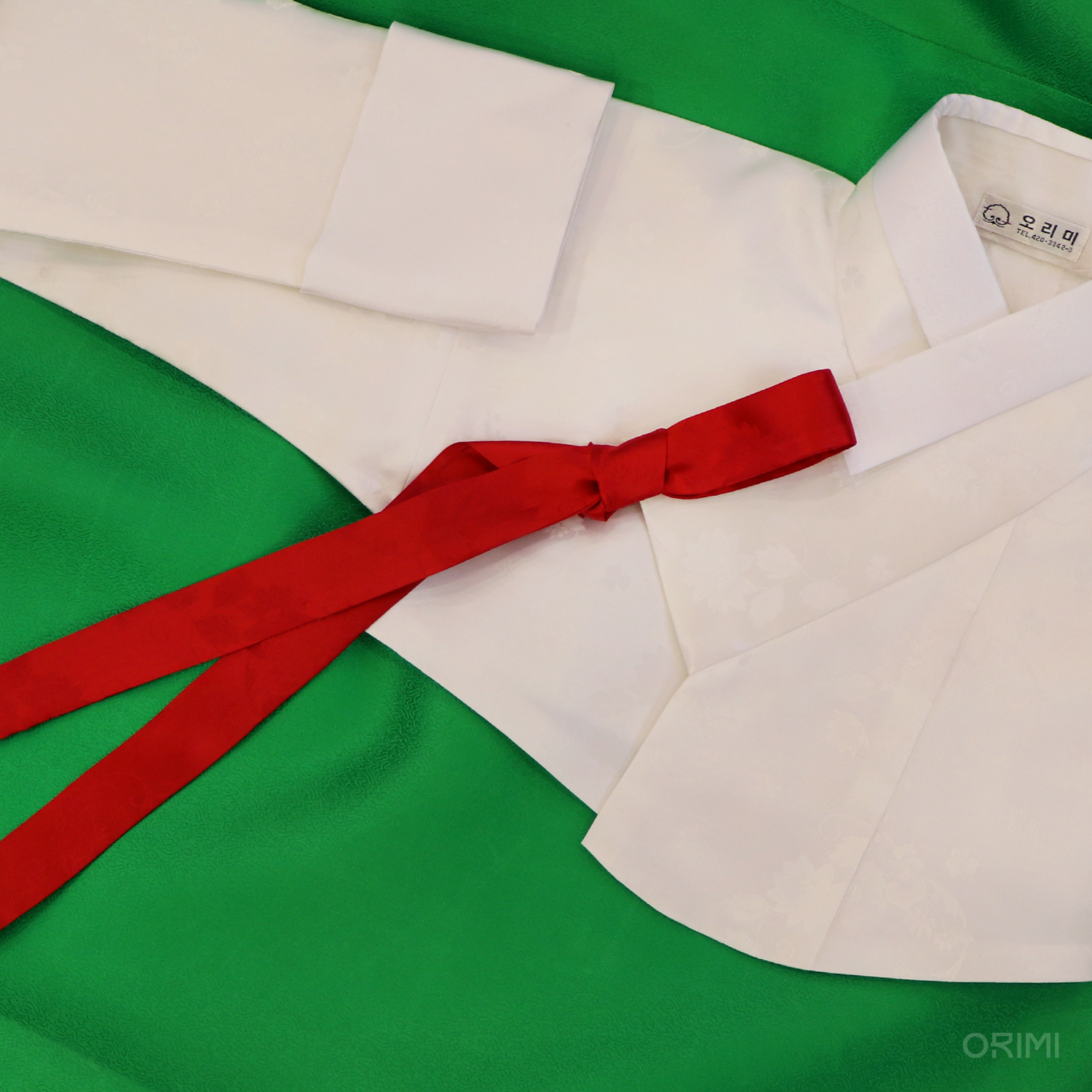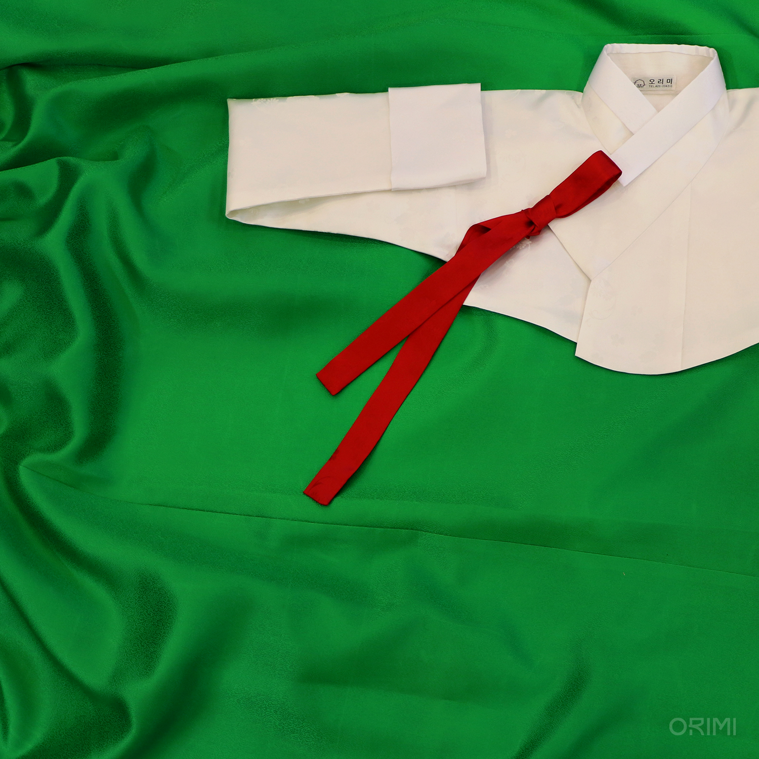 하얀 저고리와 쨍한 초록빛의 대비가 시선을 사로잡는 한 벌의 신부한복입니다.