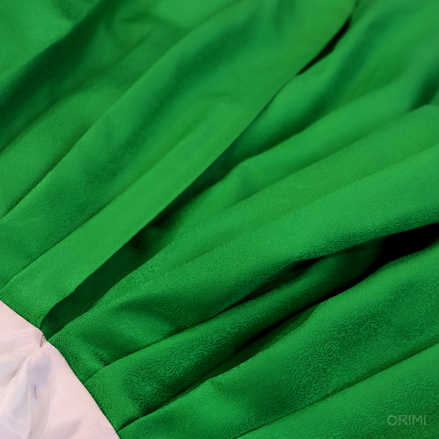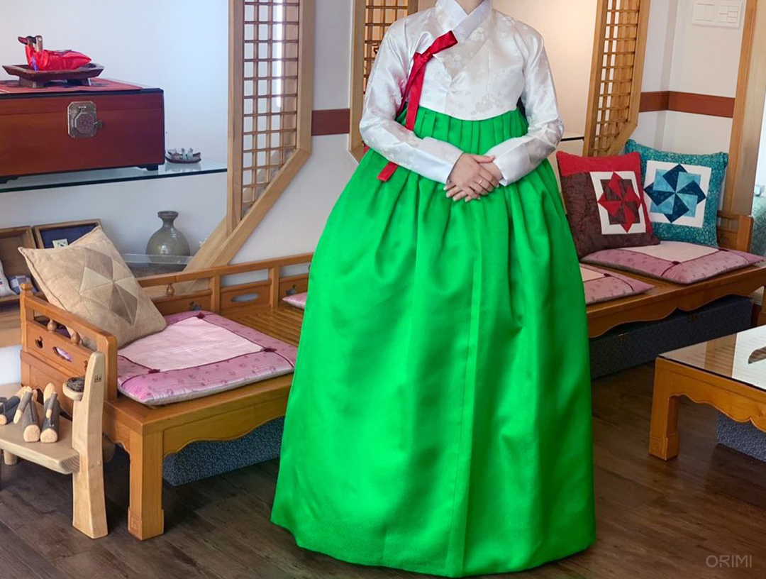 저녁에 촬영한 사진이라 짙은 초록으로 보이지만, 밝은 자연광 아래에선 형광빛이 도나 싶게 멋진 광택과 밝은 색감을 보여주는 초록 치마, 신부님께서 입은 모습은 아래에 있으니 자연광 아래에서의 색감 차이도 함께 느껴보세요.