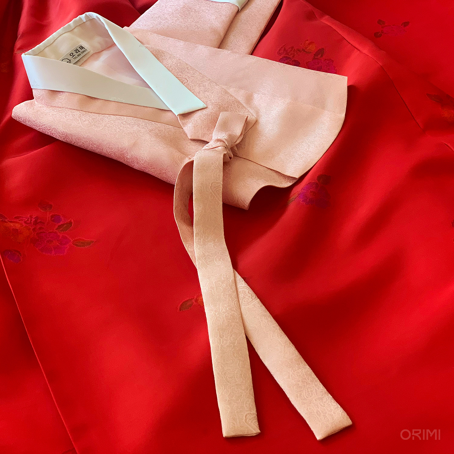 다른 색 치마와도 참 멋스럽게 잘 어울리는 연분홍색 양단 저고리와, 붉은 치마의 친정어머니 혼주한복입니다.