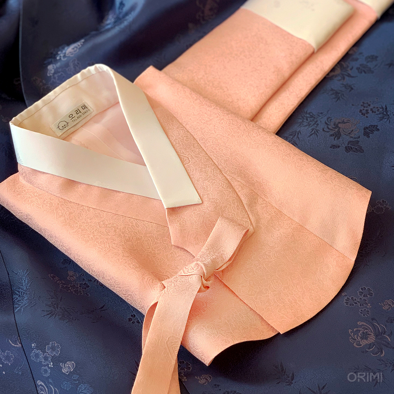 은은한 색감과 고급스러운 문양이 단아한 연분홍 저고리와, 정열적인 색감의 붉은 치마가 함께한 친정어머님의 혼주한복입니다.