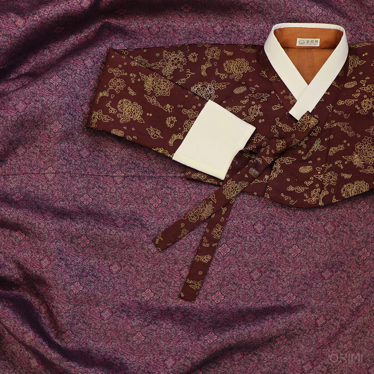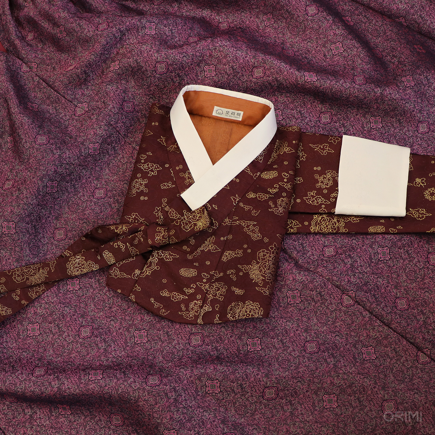 상서로운 금빛 구름문이 멋진 진빨강색 양단 저고리와 자줏빛 양단 치마를 함께한 친정어머니 혼주한복입니다.