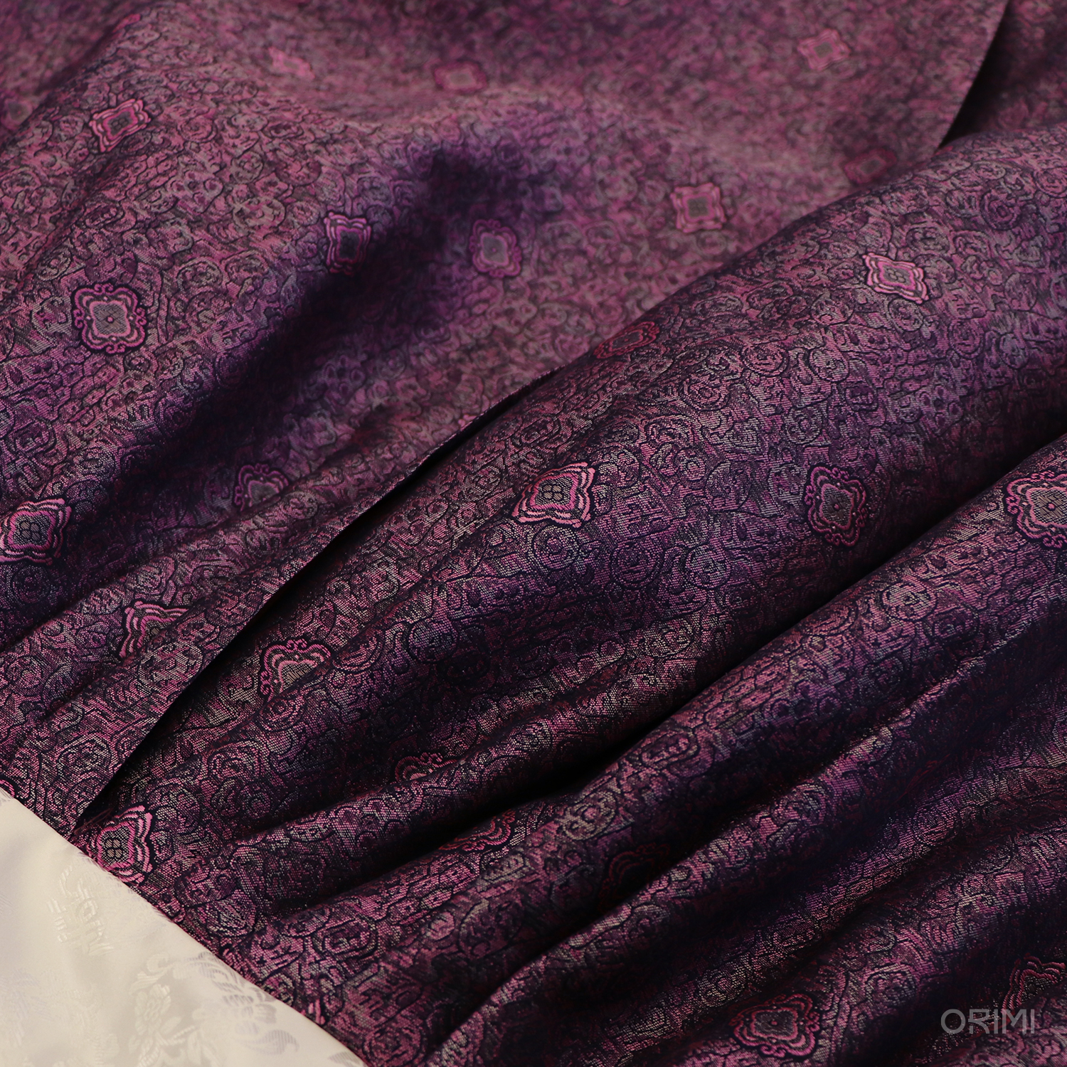 밝은 자주색 바탕에 검정, 보라, 분홍, 회색 실들이 함께 짜여지며 문양을 만들어 멋진 색감을 만들어 냅니다. 섬세한 문양과 광택이 고급스러운 치마를 만들었어요.