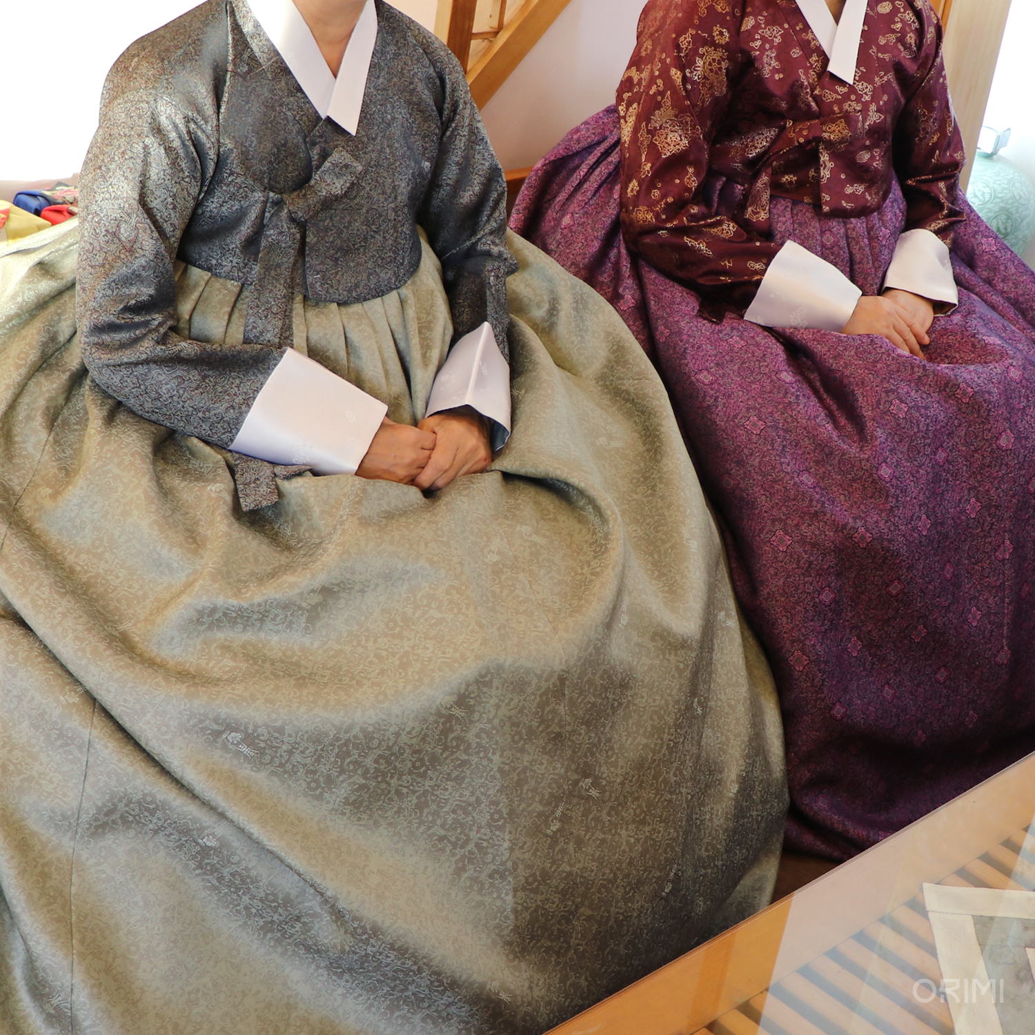 진붉은색 양단 저고리와 자주색 양단 치마의 친정어머님, 그리고 진회색 양단 저고리와 회옥색 양단 치마의 시어머님 혼주한복입니다.