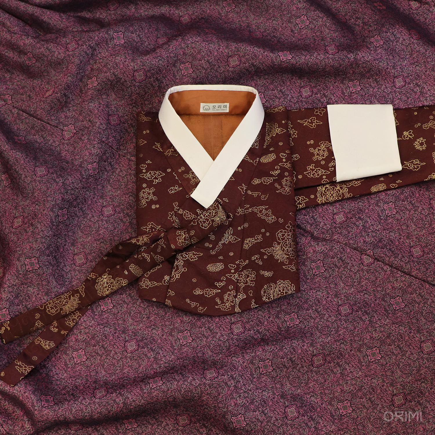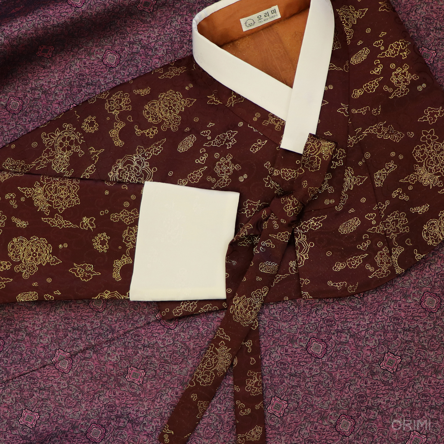 작은 구름들이 모여서 모란 문양이 되는 듯 한 아름다운 문양이 반짝이는 금사로 짜여진 진빨강 원단으로 저고리를 지었습니다.