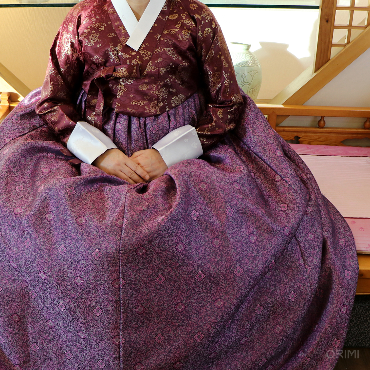 밝은 자주색 바탕에 검정, 보라, 분홍, 회색 실들이 함께 짜여지며 문양을 만들어 멋진 색감을 만들어 냅니다. 섬세한 문양과 광택이 고급스러운 치마를 만들었어요.