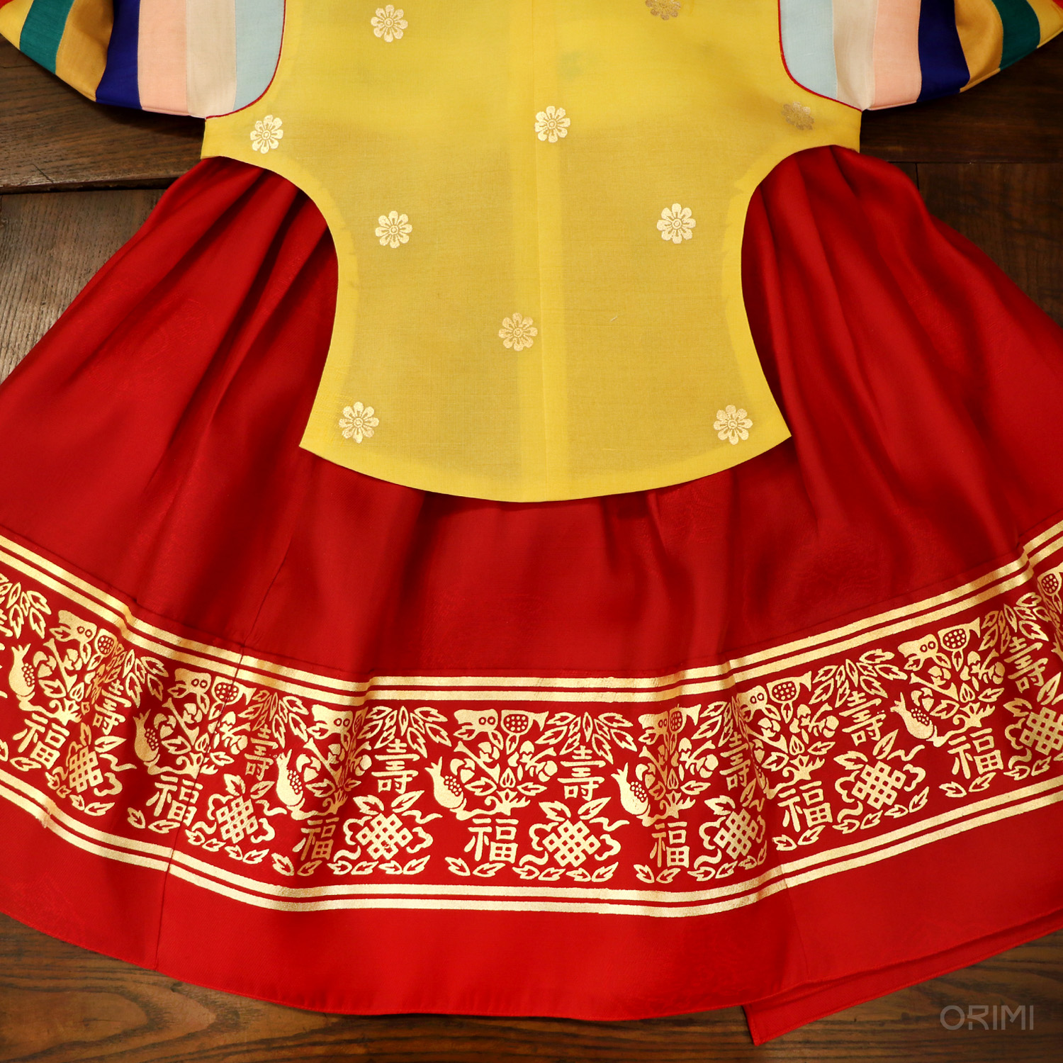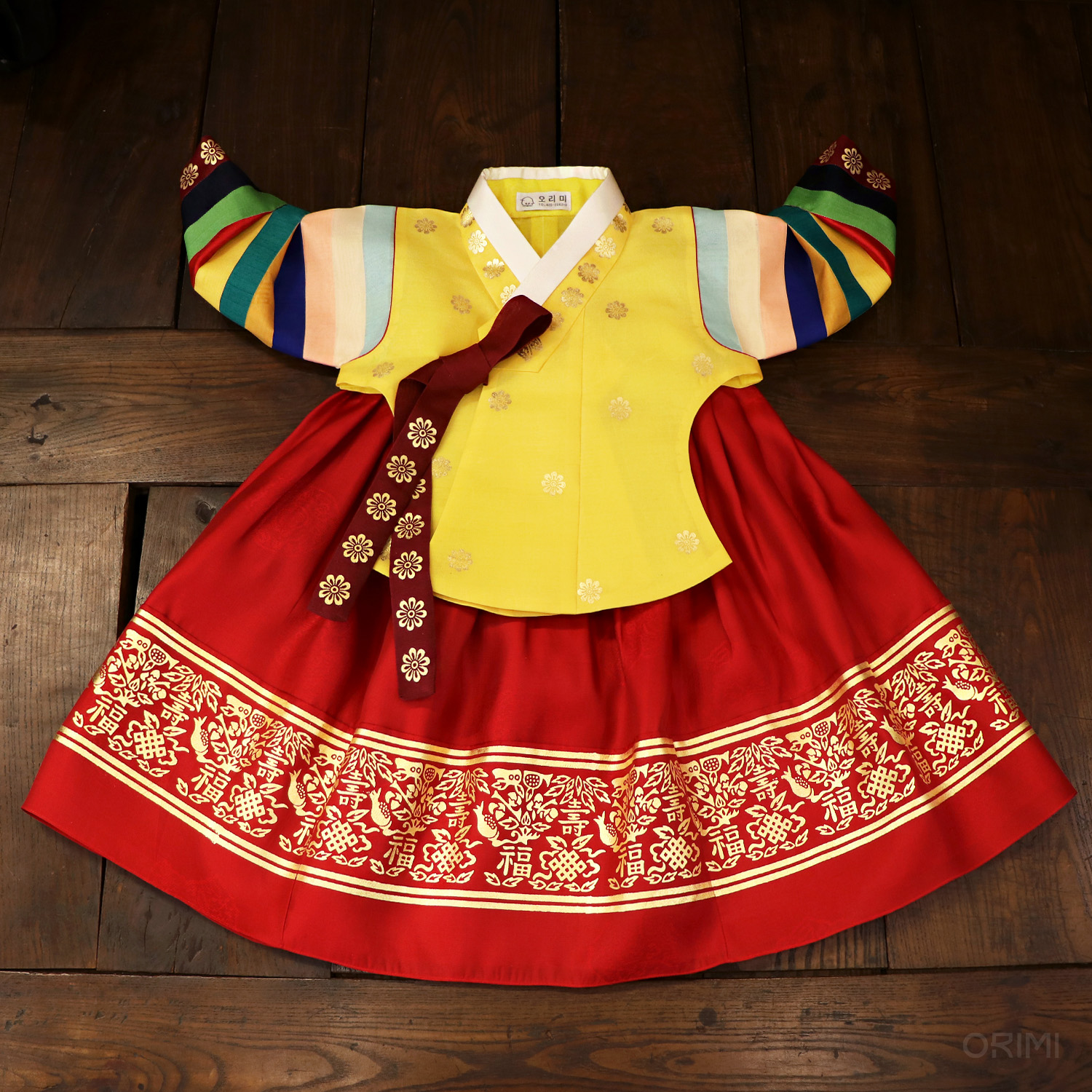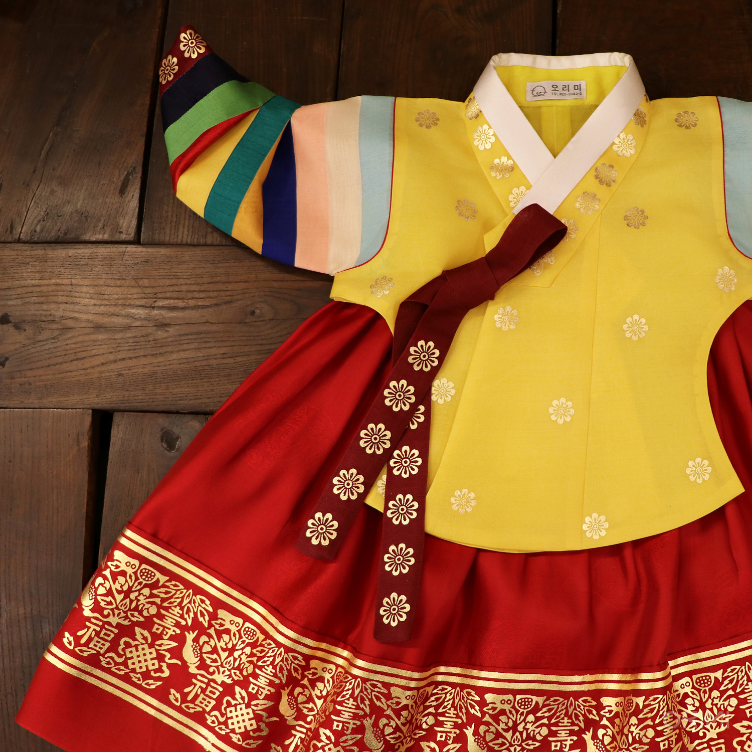 화사한 색감으로 소매를 단 노란색의 색동 당의에 갈색 고름을 달고, 금박을 화려하게 찍은 새빨간 치마를 함께한 전통적인 돌한복입니다.