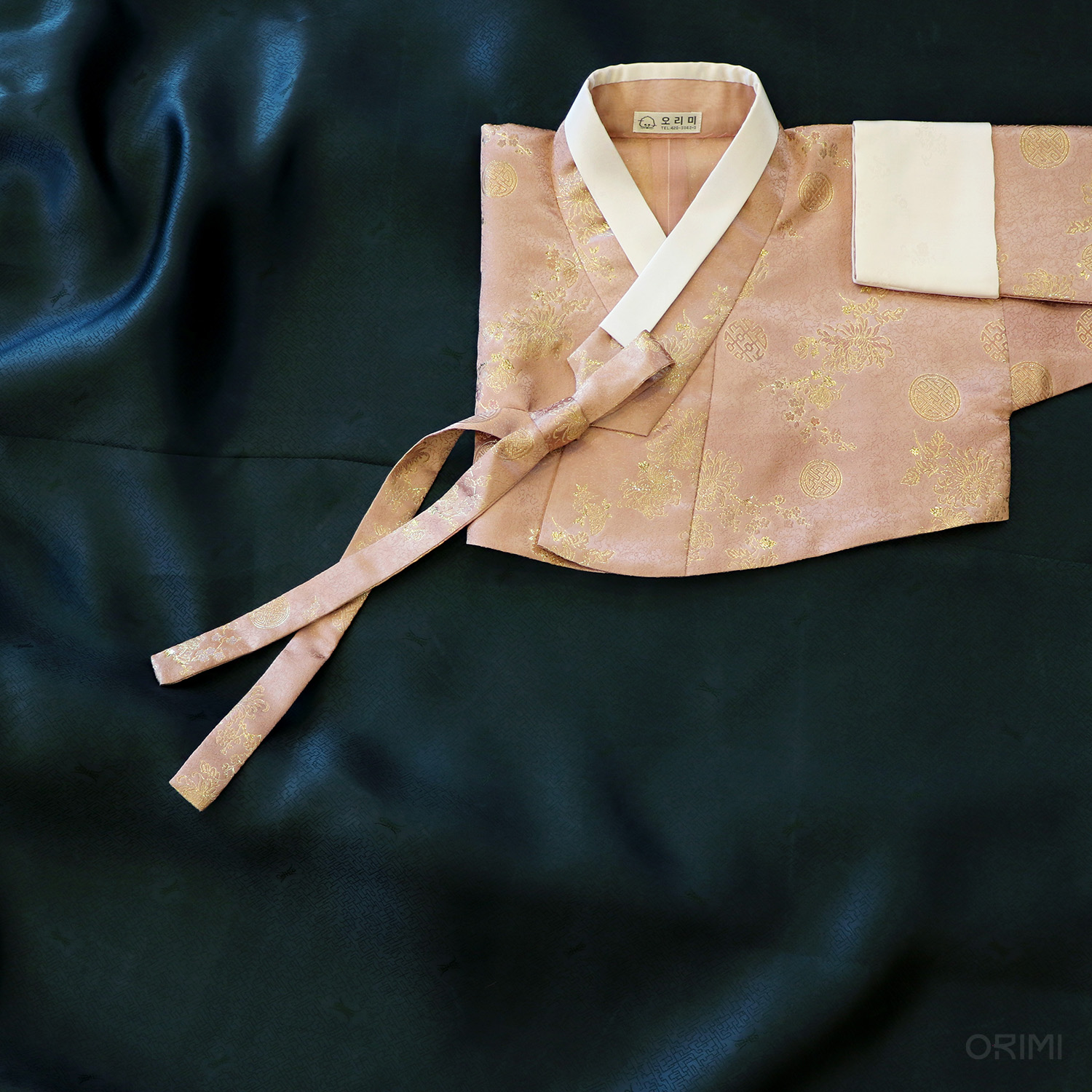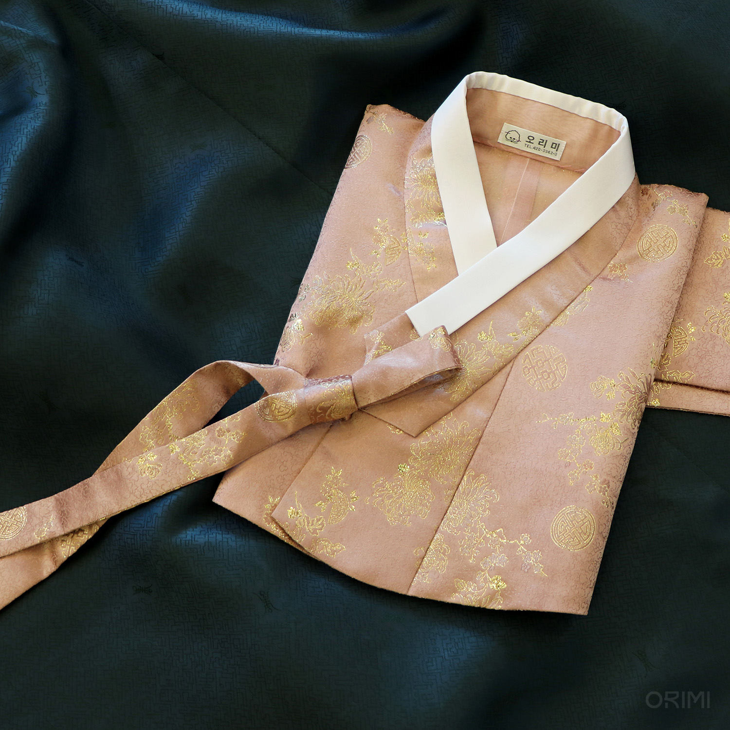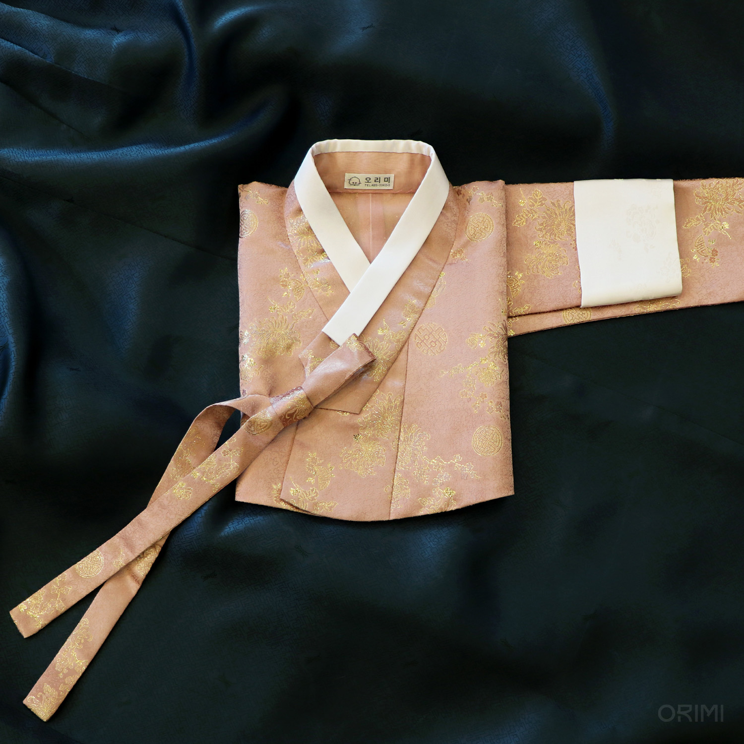 금빛 국화가 저고리 위에서 반짝반짝 빛나는, 차분한 살구색 양단 저고리와 진청록색 치마를 함께한 시조모님의 한복을 지었습니다. 손자의 결혼식을 위해 지으신 한복이에요.