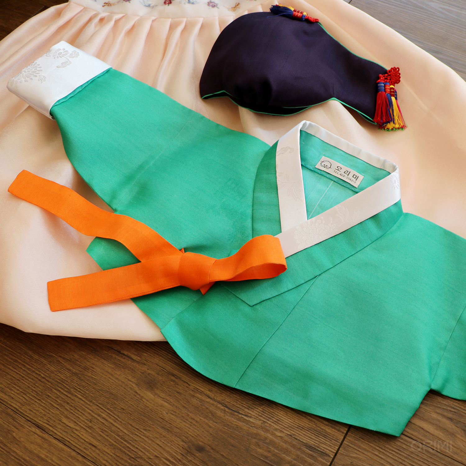 은은한 연살구빛 치마 위에 옥색 저고리를 함께한 여자아이 한복입니다. 첫 생일을 준비하는 돌한복으로 맞추신 한 벌으로, 장식을 절제하고 깔끔한 디자인과 색감에 집중해 지은 아이 옷입니다.