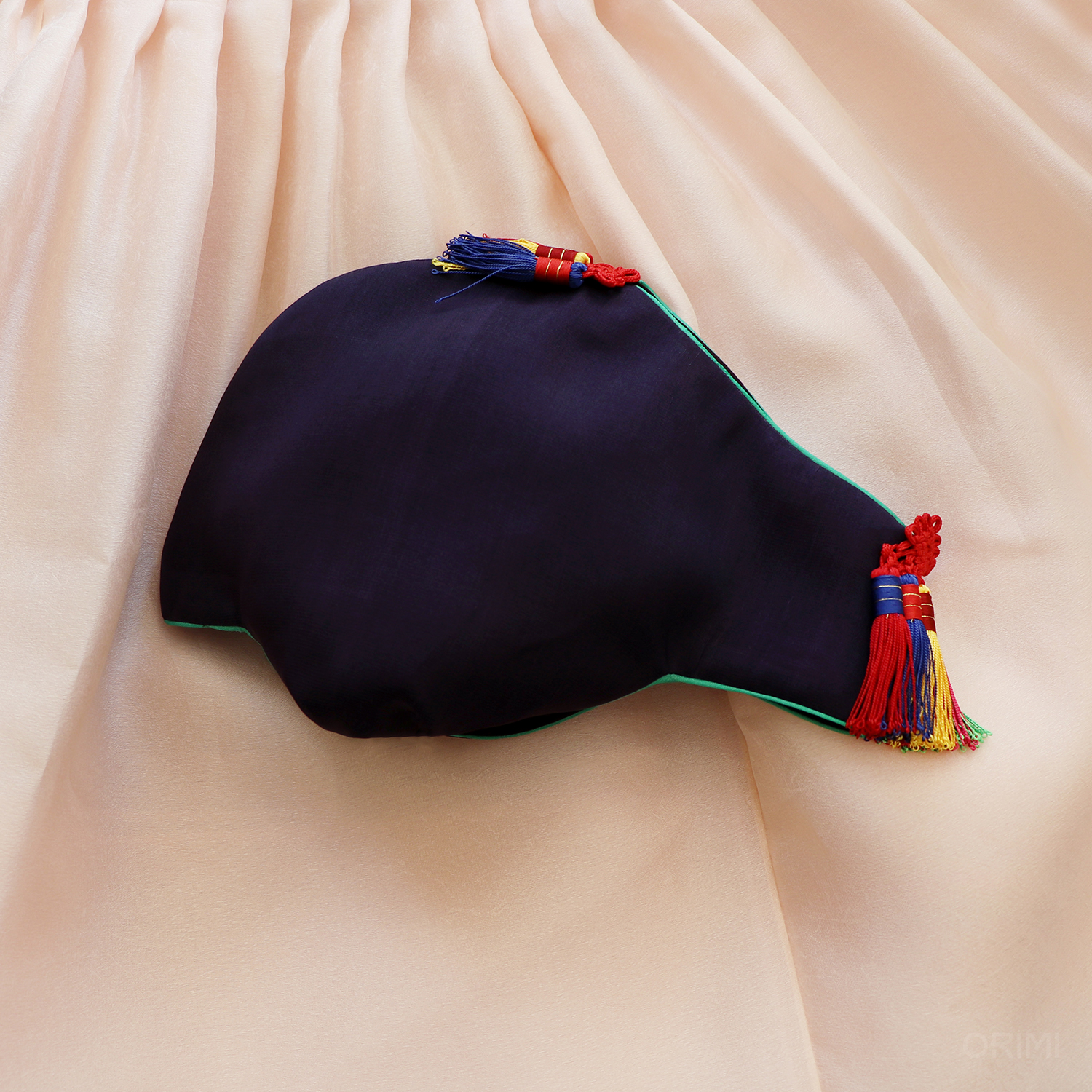 남색 조바위엔 저고리와 같은 옥색으로 테두리를 넣어 한 벌로서의 통일성을 더했습니다.