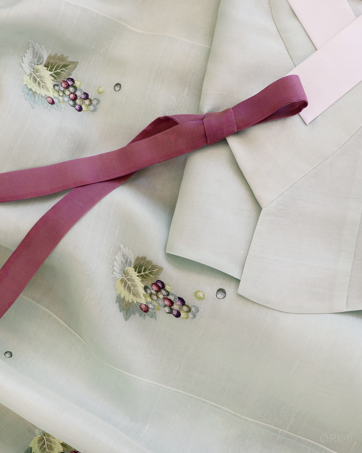 은은한 연옥색 저고리에 회자줏빛 고름을 달고, 포도가 가득 수놓인 연옥색 치마를 함께한 한복.