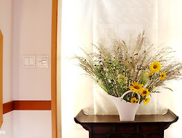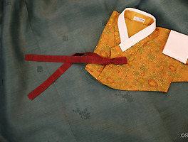 가을에 결혼하는 신부의 한복, 색감과 원단에서부터 가을 내음이 묻어나는 듯 합니다. 이 한복의 주인공인 예비 신부님께서 봄에 오리미를 방문해 미리 맞추셨던 한 벌인데요, 당시에도 가을의 날씨와 분위기를 함께 상상하며 옷을 맞추어 나갔던 기억이 생생합니다. 팔랑팔랑 춤추는 잎사귀들이 그려진 잎새단, 갈색의 잎새단은 그 색감 덕분에 잎사귀보다는 자연스럽게 낙엽으로 느껴집니다. 그래서 더욱 가을 내음을 깊게 내고 있고요. 저고리와 치마의 원단만으로도 아름다운 한 벌이라, 저고리의 고름은 같은 원단으로 통일했지만, 작은 포인트를 주기 위해 연두색 잎새단으로 안고름을 달았습니다. 연두색이 들어간 것만으로도 깊은 가을보다는, 초가을의 느낌이 나지 않나요? 진붉은색과 고동색, 진노랑, 풀색의 얇은 선들이 가로, 세로..