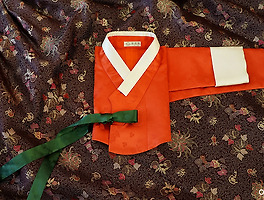 금사양단 (2) 썸네일형 리스트형 검정 금사 쾌자와 노랑 바지 저고리의 돌 한복 검정 바탕에 금사로 꽃 문양이 화려하게 짜여져 강렬한 양단으로 지은 쾌자와 복건. 금색 문양과 안에 입은 노란색 저고리와 바지 색상이 어우러져 더욱 화사해진, 아이의 첫 한복입니다. 용과 모란꽃이 어우러진 문양이 짜여진 노랑 원단으로 저고리와 바지를 지었습니다. 화사한 노랑색 바탕 위에 흰색의 용과, 연노랑색 모란이 얽혀 꿈틀대는 문양이 화려한 원단이죠. 검정 바탕 위에서 반짝이는 금사가 저고리의 노랑색과 어우러져 한층 더 화사해지는 듯 합니다. 바짓단에 들어간 빨간 색상과 잘 어울리는 빠알간 복주머니와 사랑스러운 신발까지, 아이의 첫 한복과 함께 구성되는 소품들입니다. 검정 바탕에 금사로 꽃 문양이 화려하게 짜여져 강렬한 양단으로 지은 쾌자와 복건, 노랑 저고리와 바지로 구성된 돌 한복입니다. 주홍 저고리와 자주색 금사 국화문 치마, 친정어머니 혼주한복 선명한 주홍색이 눈을 사로잡았다가 진자주색 치마에 놓인 금사 문양의 화려함에 또다시 눈길을 빼앗기는 한 벌, 오리미의 친정어머니 혼주한복입니다. 섬세한 문양과 금빛으로 가득한 이 화려한 치마 위에서 오로지 선명한 색상 하나만으로 존재감을 발하는 저고리입니다. 올 겨울, 유독 많은 분들의 사랑을 받고 있는 원단입니다. 아무리 사랑받는다 해도 저희가 소장한 원단 양의 한계로 몇 벌 만들지 못하지만요. 많은 사랑을 받는 것에는 다 이유가 있겠죠? 중후한 색이면서도 고혹적인 진자주색 바탕, 그리고 이렇게나 금사가 많이 쓰였는데도 섬세하게 잘 구성된 문양들의 어우러짐이 경박스럽지 않은 화사함을 지녔거든요. 전부 붉은 색 계열만으로 짜여지고 구성된 이 한 벌에 유일하게 다른 색인 진초록으로 고름을 달아 주니 저고리.. 이전 1 다음