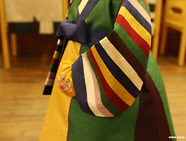 오방장 두루마기를 꺼내보았어요. 깜찍한 복주머니도 하나 들고요. 배색이 차분하면서도 귀티를 내는 것이 참 아름답지 않나요. 첫돌에 입히는 옷으로, 겉에 입는 두루마기에요. 남녀에 따라 깃과 고름, 무의 색을 다르게 해서 만들어져요. 남자아이는 깃, 고름, 돌띠를 모두 남색으로 하고 무를 자색으로 하고- 여자아이는 깃, 고름, 돌띠를 홍색이나 자색으로 하고 무를 남색으로 했답니다. 요 오방장두루마기를 입을 때에는 전복을 입고 돌띠를 매는 게 일반적이죠. 머리에는 호건이나 복건을 쓰고요- 책에서 보면, 오방장 두루마기는 오행설에서 연유된 오방색 (청, 백, 적, 흑, 황)을 사용해 잡귀를 물리치고 오방으로부터 행운이 들어오길 기원하는 뜻에서 주로 상류층의 남아 돌이나 명절에 저고리 위에 입히던 두루마기라고 ..