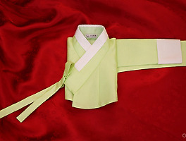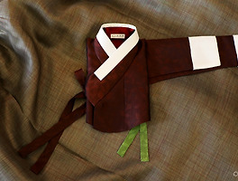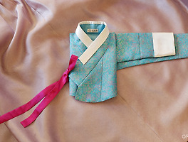 가을에 결혼하는 신부의 한복, 색감과 원단에서부터 가을 내음이 묻어나는 듯 합니다. 이 한복의 주인공인 예비 신부님께서 봄에 오리미를 방문해 미리 맞추셨던 한 벌인데요, 당시에도 가을의 날씨와 분위기를 함께 상상하며 옷을 맞추어 나갔던 기억이 생생합니다. 팔랑팔랑 춤추는 잎사귀들이 그려진 잎새단, 갈색의 잎새단은 그 색감 덕분에 잎사귀보다는 자연스럽게 낙엽으로 느껴집니다. 그래서 더욱 가을 내음을 깊게 내고 있고요. 저고리와 치마의 원단만으로도 아름다운 한 벌이라, 저고리의 고름은 같은 원단으로 통일했지만, 작은 포인트를 주기 위해 연두색 잎새단으로 안고름을 달았습니다. 연두색이 들어간 것만으로도 깊은 가을보다는, 초가을의 느낌이 나지 않나요? 진붉은색과 고동색, 진노랑, 풀색의 얇은 선들이 가로, 세로..